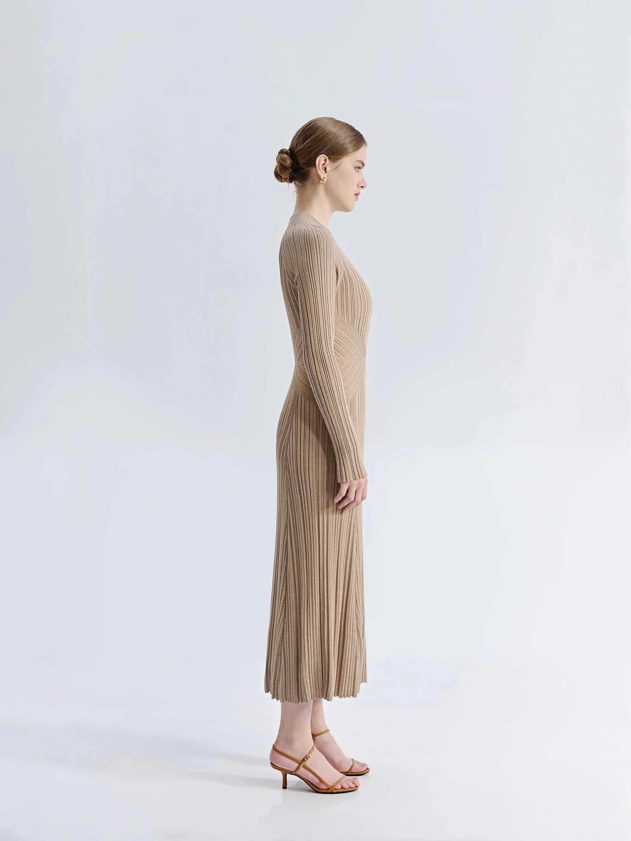 The Arden Knit Dress features a flattering fit-and-flare design with ribbed knitting and multi-directional seams that accentuate the waist. The metallic-finish fabric catches light beautifully, creating a sense of depth and dimension. With a structured bodice and fluid hemline, the silhouette moves gracefully, making it an easy choice for both day and evening wear.