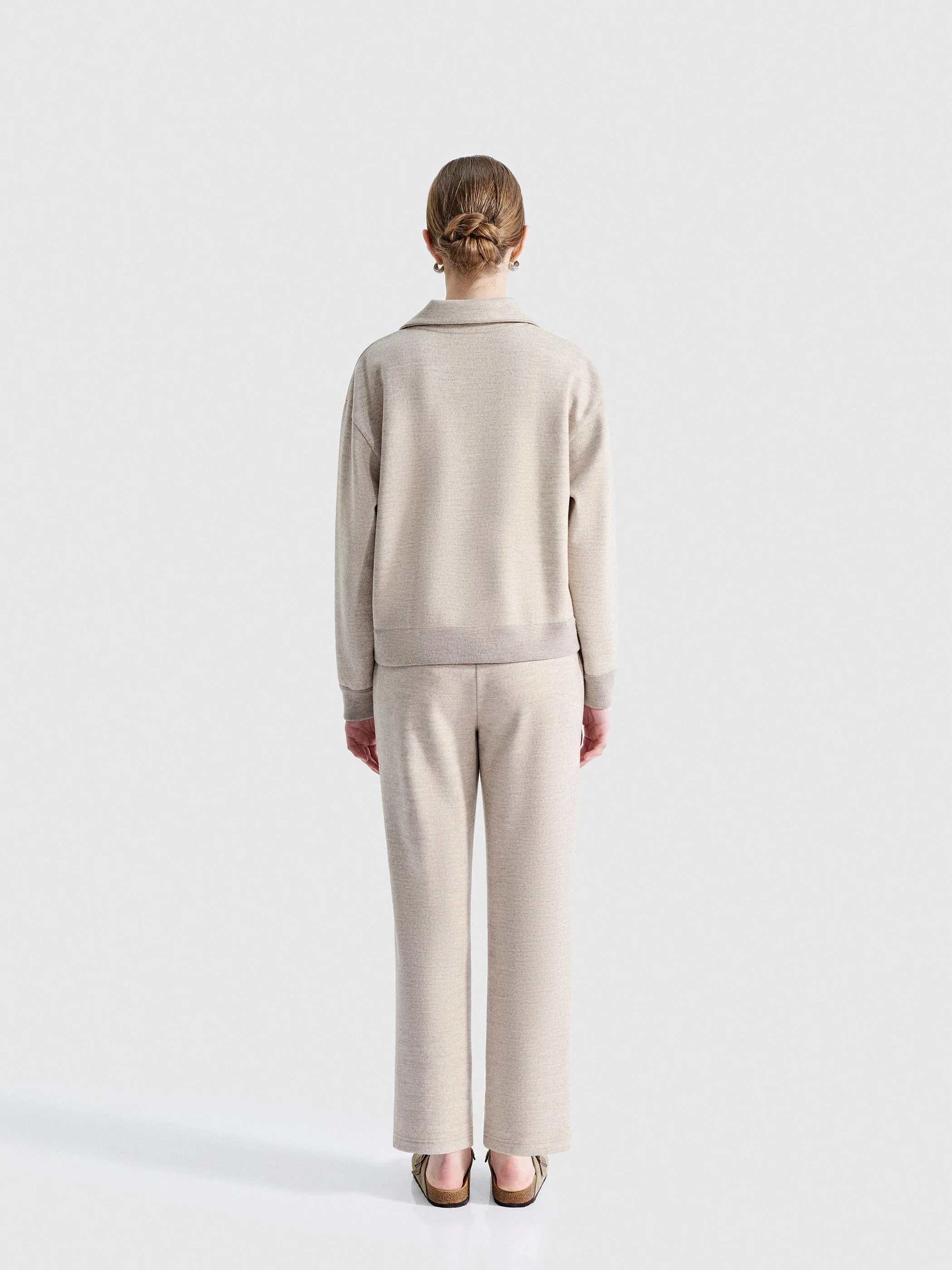 Crafted from a double-sided knitted blend of wool, cotton, polyester, and viscose, this fabric balances softness, breathability, and durability. Made with combed wool-blended yarn, it offers a smooth feel, excellent moisture absorption, and natural insulation while allowing effortless movement. While polyester and viscose enhance longevity, we acknowledge their environmental impact and remain committed to exploring more sustainable alternatives.