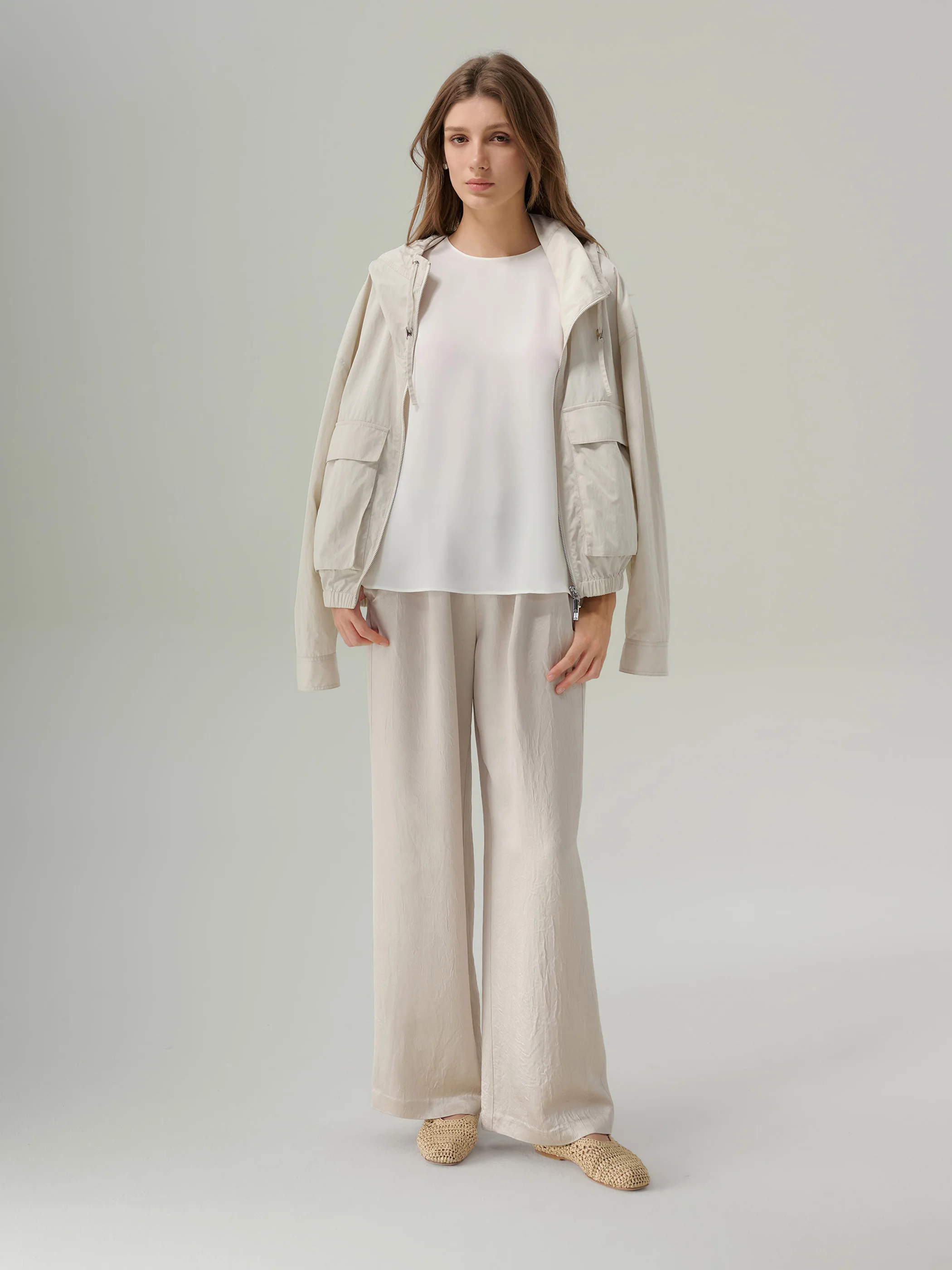 Designed for layering, the Aven Oversized Jacket balances utility with a modern silhouette. The boxy fit is cinched at the hem with subtle elastic detailing, while oversized patch pockets and a two-way zipper add functional, comfortable appeal. Adjust the zipper to play with the shape and allow for added ease of movement at the hem. A structured hood with adjustable toggles offers protection against the elements without disrupting the jacketās clean lines. Finished with tailored cuffs and tonal topstitching, it pairs effortlessly with both polished separates and everyday essentials.