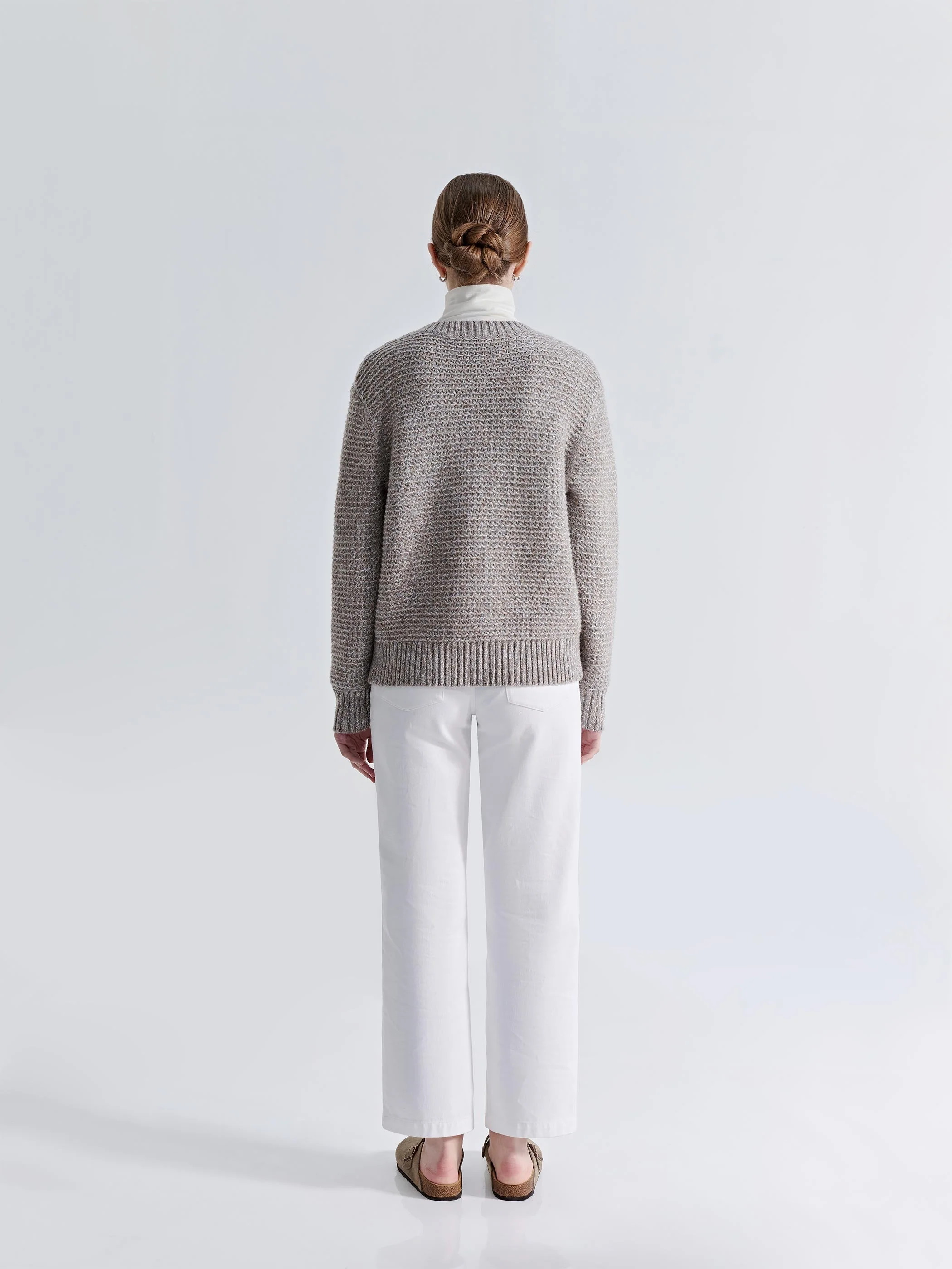 The Cleo Heavyweight Wool Knit is the luxe chunky knit staple for your autumn wardrobe. Crafted from 100% wool, this sweater offers both warmth and a unique, multi-coloured pebble-knit texture. Whether layered or worn solo, this piece adapts effortlessly to your needs, making it perfect for transitioning from mild autumn days to colder winter months.