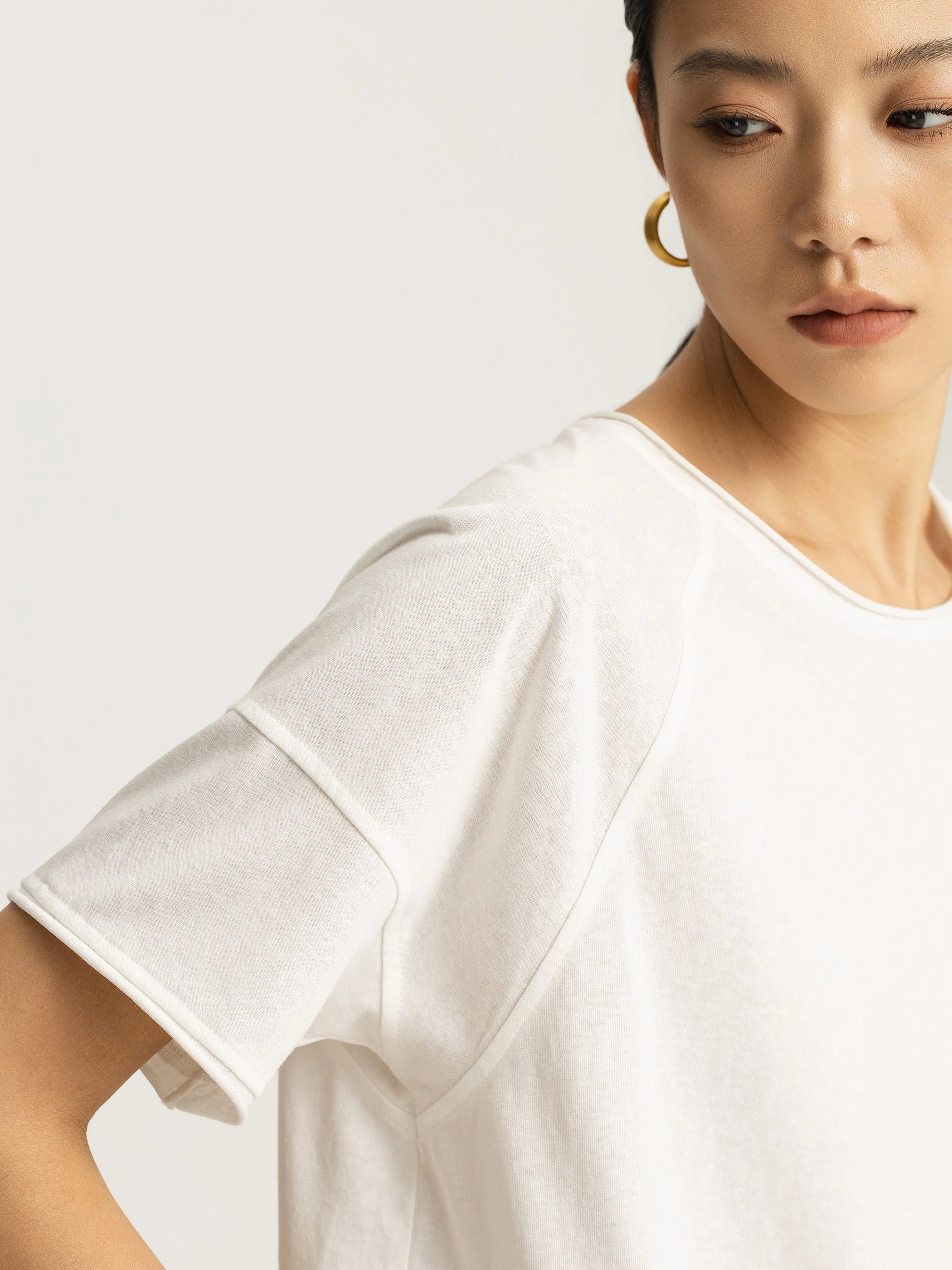 An elevated essential for everyday ease, the Elara Cotton Raglan Tee is rendered in clean white with a softly structured silhouette. Designed with a classic crew neckline and short raglan sleeves, it allows for ease through the shoulders while maintaining a streamlined shape. Subtle flat-felled seams and bias-bound hems enhance its minimal design.