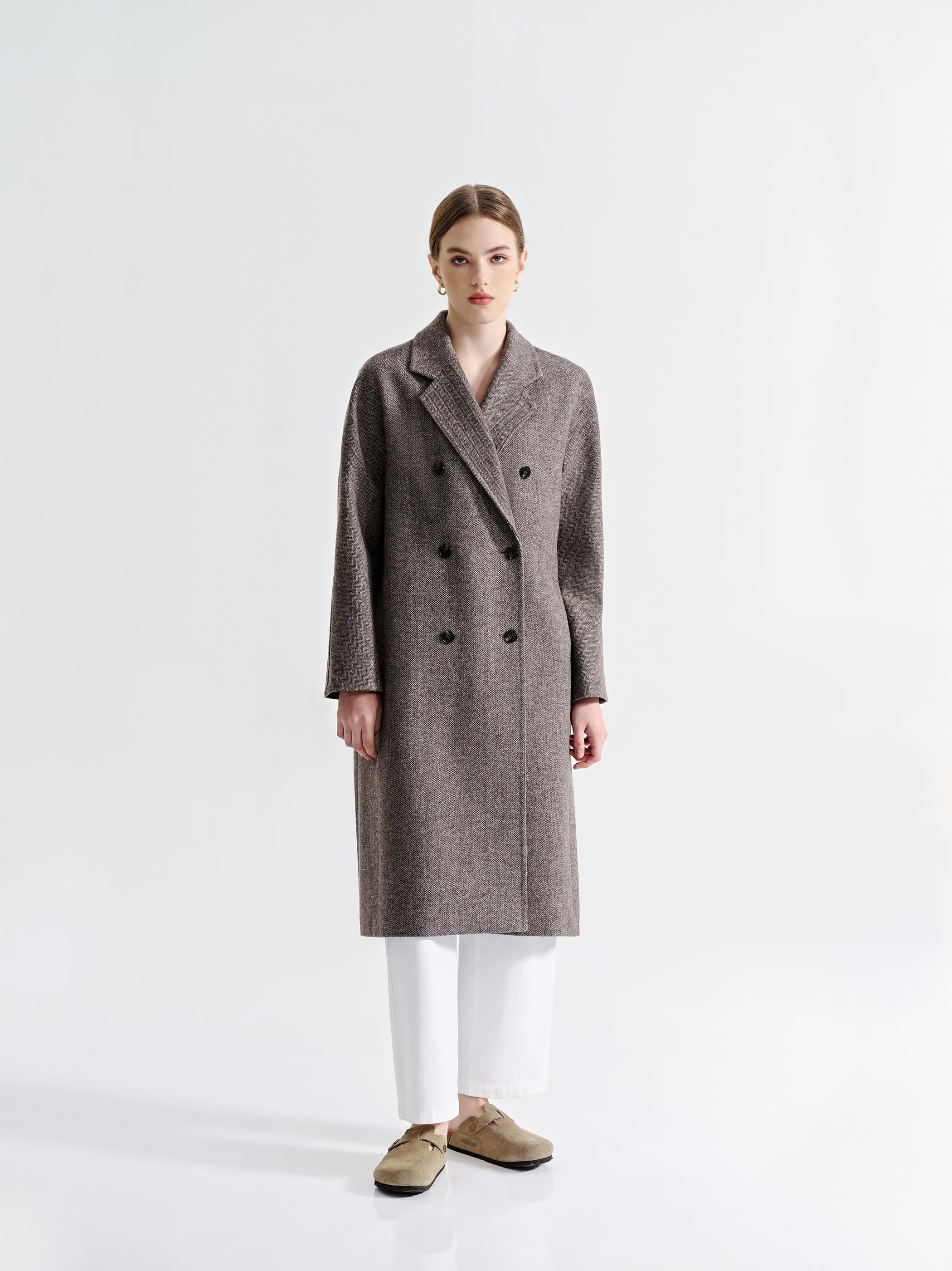 A modern take on a classic, the Elara Double-Breasted Wool Coat is tailored in a structured herringbone weave. Its notched lapels, full-length silhouette, and double-breasted closure lend a sharp, timeless appeal, easily transitioning between professional and casual wear. Functional inseam pockets help keep essentials close.