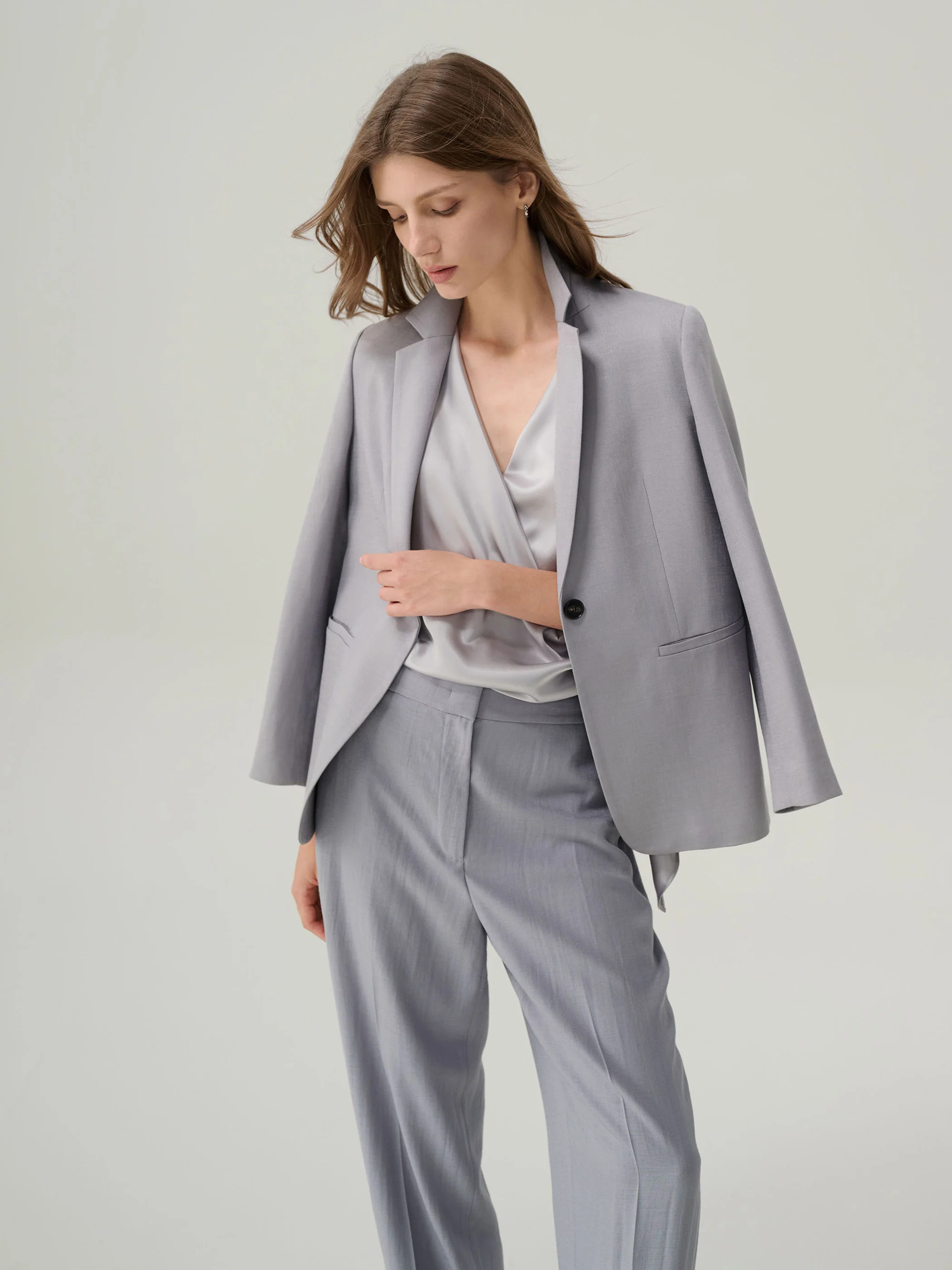 The Eliza Silk Suit Pants offer a refined silhouette with a softly structured drape. Designed in a muted rock-grey hue, these trousers feature a flat-front waistband, discreet side pockets, and welt pockets at the back for a clean finish. Pressed front creases elongate the leg, while a concealed hook-and-bar closure keeps the look polished and minimal.
