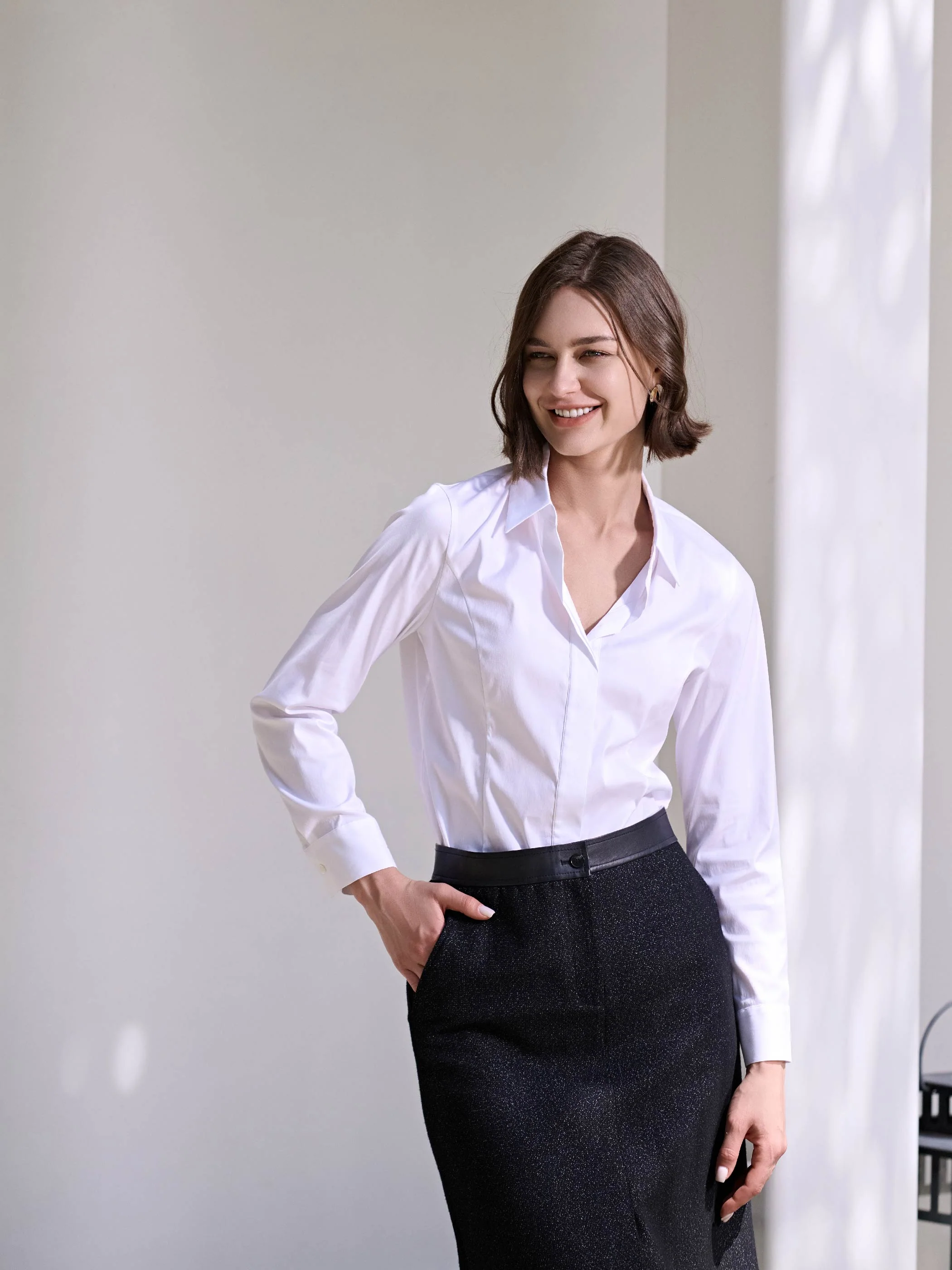 A wardrobe essential, the Fitted Cotton Button-Down Shirt is precision-tailored to create a flattering, feminine silhouette. Its sharp collar, concealed placket, and crisp topstitching give this classic white shirt a refined, minimalist finish. Designed with contoured seaming along the waist, this shirt can be worn solo or layered under a structured blazer.
