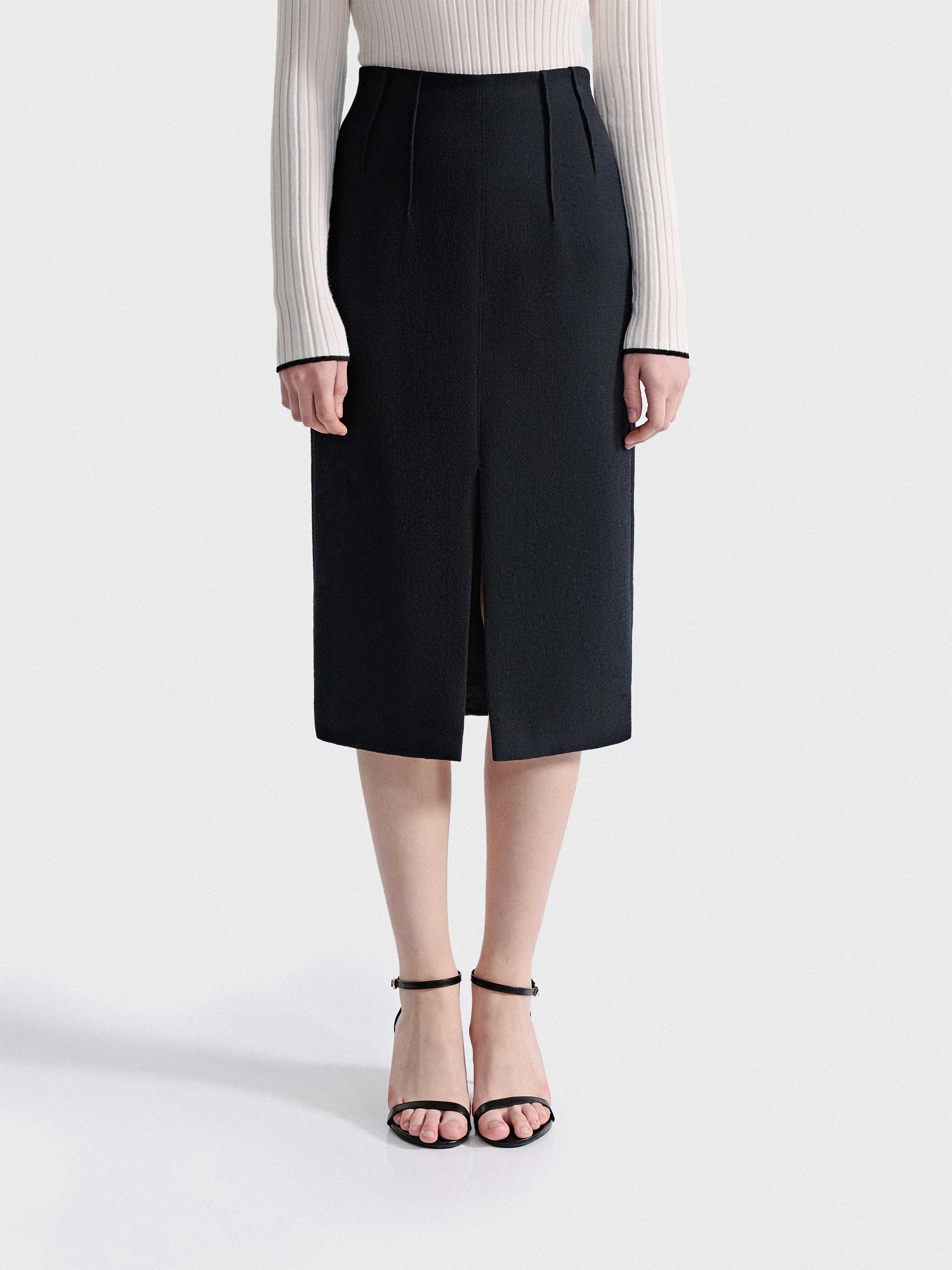 A modern update to the classic pencil skirt, the Ivy Wool Skirt features exposed dart seams and a front slit, adding a contemporary edge to its timeless silhouette. Fully lined with a high waist and midi length, it creates an elongating effect with a structured yet fluid drape. A concealed back zipper ensures a seamless fit and clean finish, making it a standout choice for workwear, evening outfits, or elevated everyday styling.