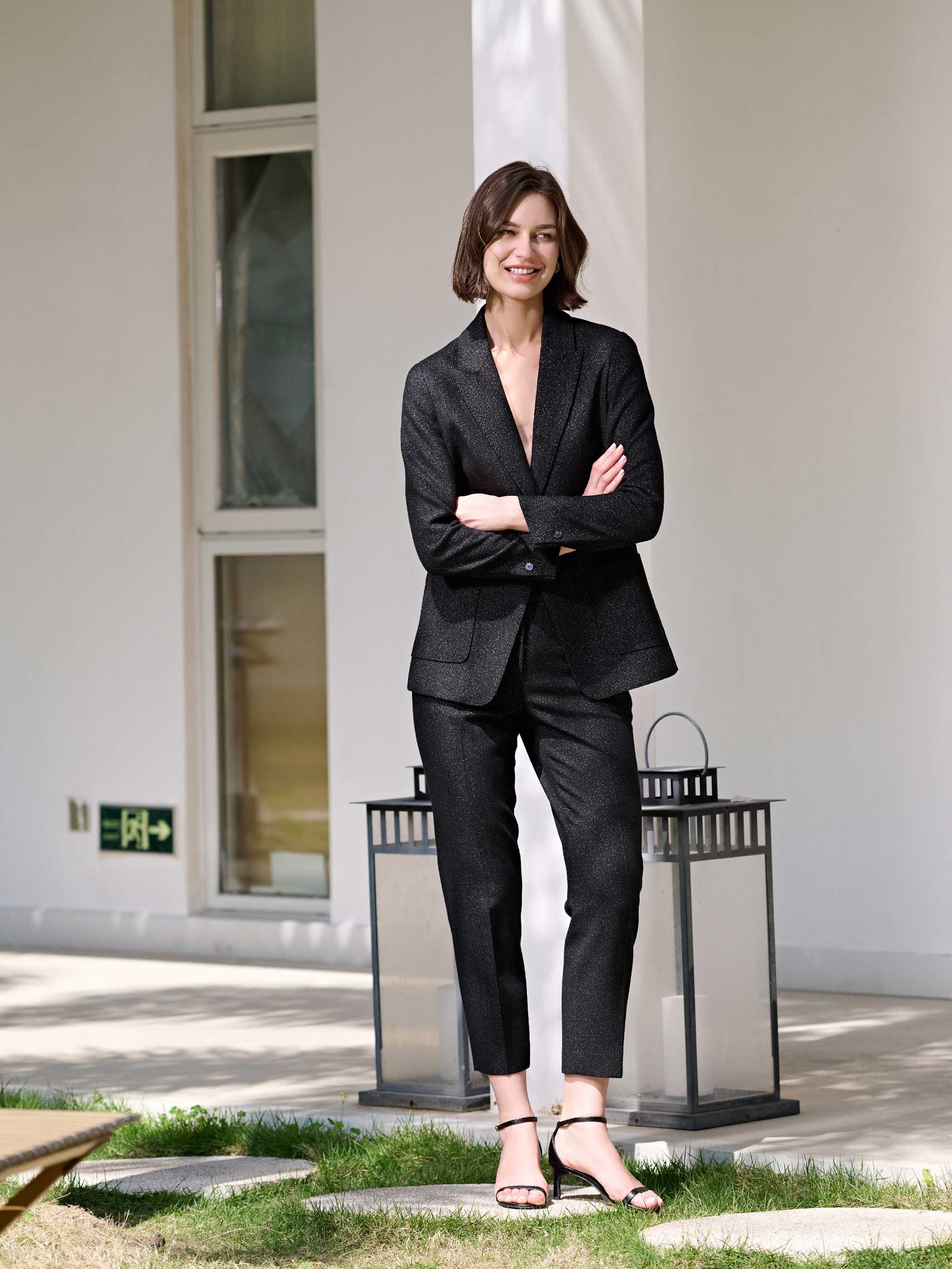 Crafted from a refined blend of sheep wool and polyester, this tweed fabric offers natural softness with a resilient structure. Fine silver thread adds a subtle luster that enhances its textured finish. Wool provides breathable warmth and a smooth hand, while polyester lends wrinkle resistance and lasting durability. While we value the performance benefits of polyester, we remain committed to seeking more sustainable alternatives in our sourcing practices.