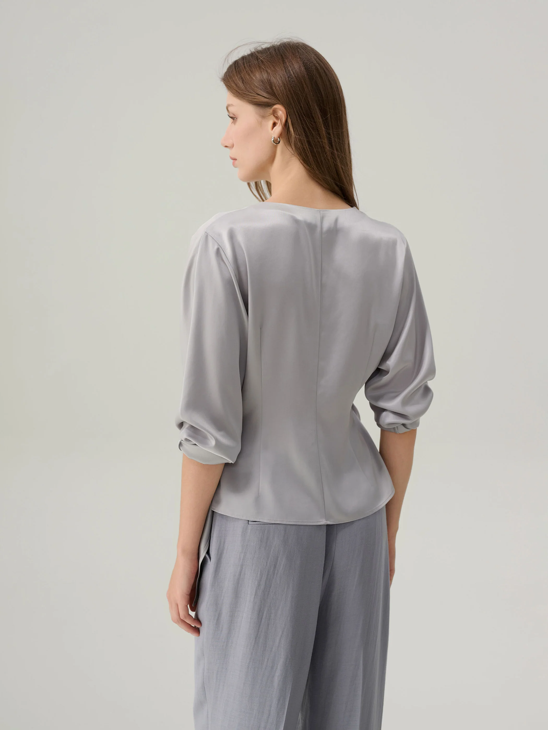 Refined and fluid, the Juliette Satin Wrap Blouse is cut from lustrous pale grey satin that drapes effortlessly over the frame. Designed with a flattering V-neckline and adjustable side tie, itās finished with hammered metallic buttons. Equally suited for day or evening, it pairs seamlessly with both tailored trousers and flowing skirts.