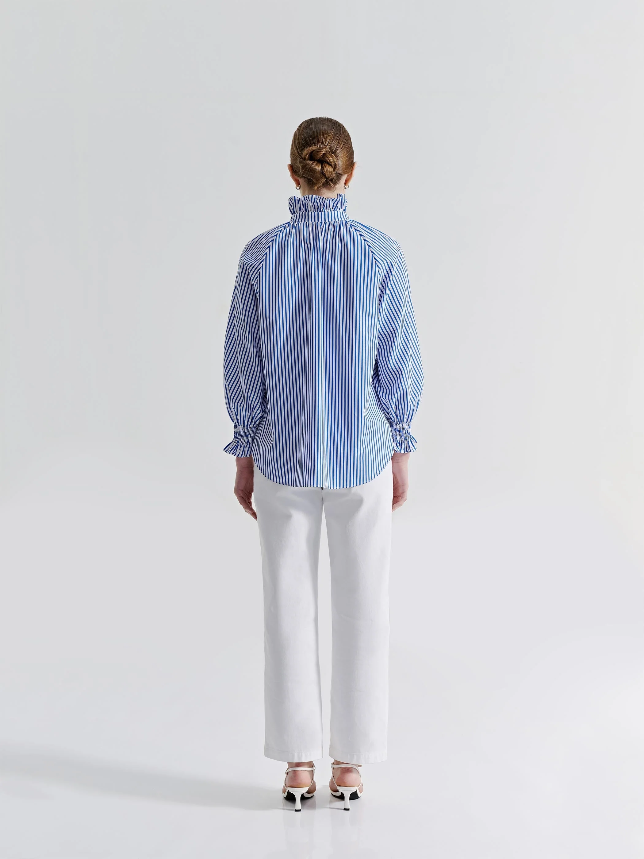 The Flounce Top combines classic elegance with modern femininity. Designed with a high ruffled collar, voluminous raglan sleeves, and smocked cuffs, it offers a playful yet effortless silhouette. Pair it with tailored trousers for a sophisticated appeal, or tuck it into denim for a versatile, everyday look.