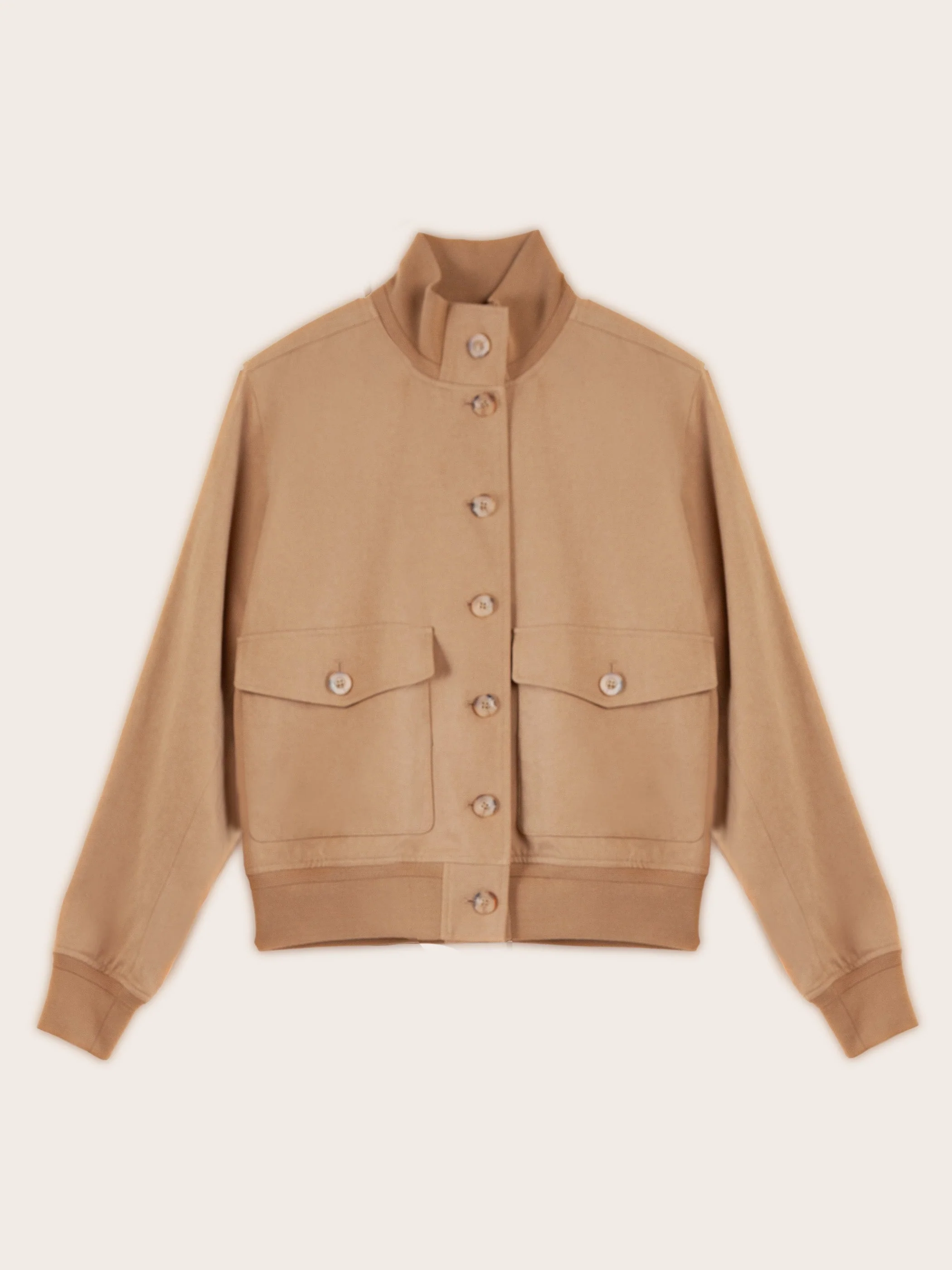 A modern take on the bomber silhouette, the Margot Twill Bomber Jacket is crafted in a structured cotton twill with a soft brushed finish. Designed with a clean stand collar and tonal buttons, it features dual flap pockets and subtle volume through the sleeves. The ribbed hem and cuffs lend balance to the boxy cut, while its warm khaki tone layers effortlessly over your other staples.