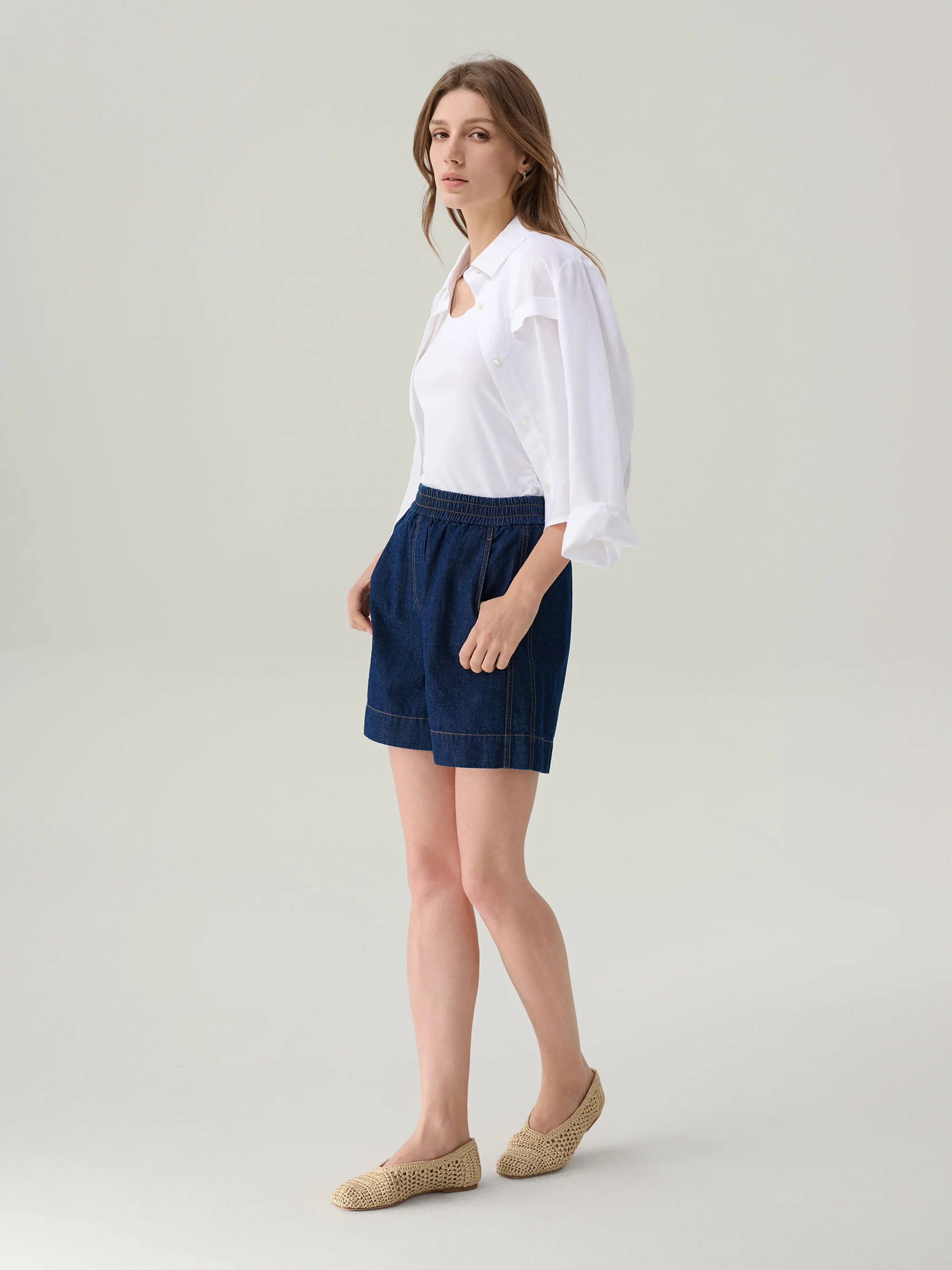 The Ruby Cotton Shorts offer a relaxed take on denim, crafted from lightweight indigo cotton with contrast topstitching for a classic finish. An elasticized waistband ensures all-day comfort, while front slash pockets and a single back patch pocket add casual functionality. The wide leg cut allows easy movementāideal for warm-weather wear.
