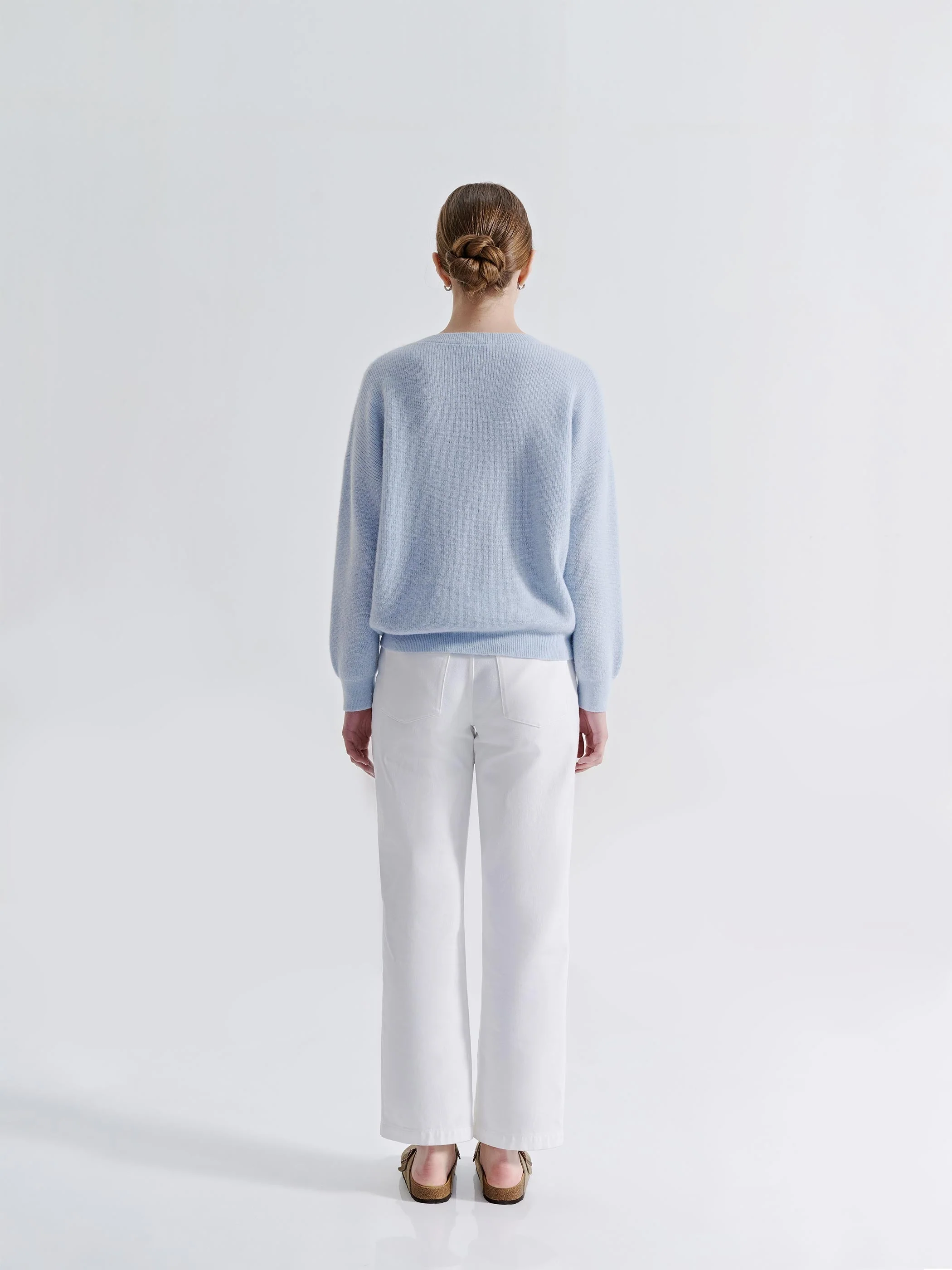 The Cloud Blue Sweater is designed with a relaxed, oversized silhouette and dropped shoulders, creating an effortless yet structured drape. Finely ribbed detailing at the crew neckline, cuffs, and hem enhances durability while maintaining a soft, cozy feel. Pair it with tailored trousers for a polished look or with relaxed denim for understated, everyday ease.